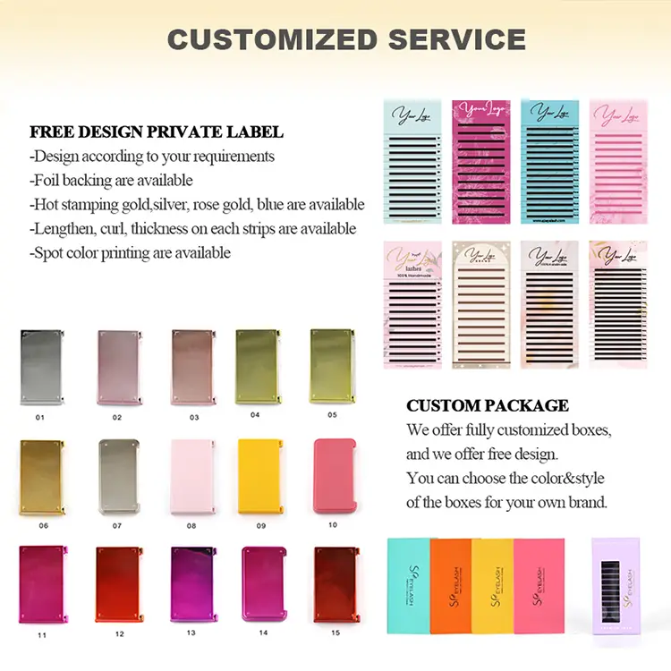এসপি আইল্যাশ ল্যাশ এক্সটেনশন ব্যক্তিগতকরণের শক্তিতে বিশ্বাস করে। অতএব, আমরা আইল্যাশ এক্সটেনশন পণ্যগুলির জন্য কাস্টমাইজড পরিষেবা সরবরাহ করি। একটি অনন্য ব্র্যান্ড চিত্র তৈরি করতে আপনি আইল্যাশ পণ্যগুলিতে আপনার লোগোটি মুদ্রণ করতে পারেন।